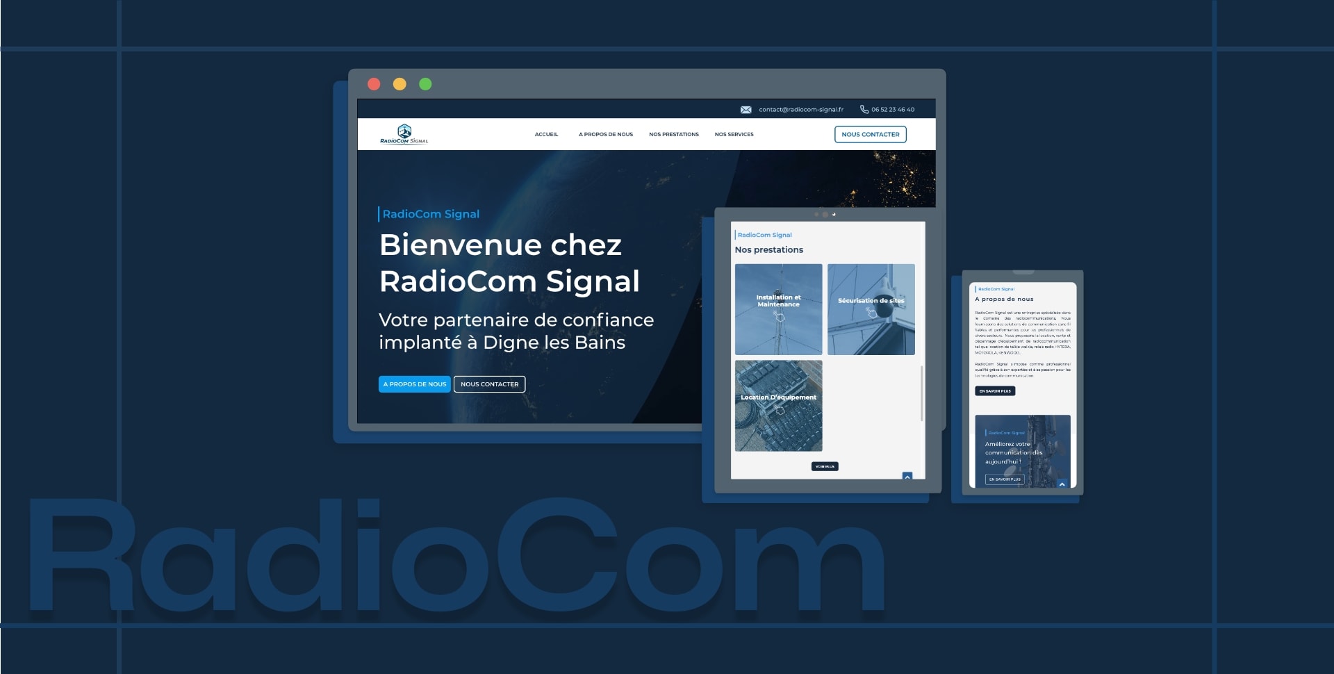 Le nouveau site web de RadioCom Signal se distingue par sa navigation fluide, son design épuré et ses fonctionnalités optimisées pour offrir une expérience utilisateur exceptionnelle. Chaque page présente de manière concise et précise les solutions offertes, alliant professionnalisme et accessibilité pour les visiteurs.